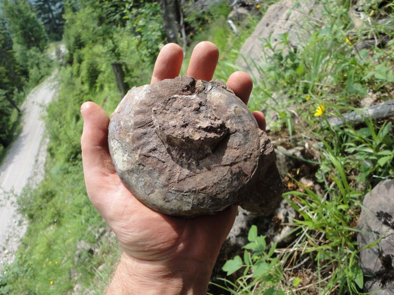 In der Nähe von Hinterriß entdeckte ich vor ein paar Jahren direkt an einer Forststraße einen abgestürzten Brocken, der voll mit angewitterten, aber recht gut erhaltenen Ammoniten war. Ich setzte weiter oben in der Felswand den Meißel an und konnte auf Anhieb zwei recht große Ammoniten aus der sogenannten „marmoreum-Kruste“ bergen: Schlotheimia pachygaster und Angulaticeras marmoreum. In dem Horizont sind die Ammoniten dunkelbraun von Eisenoxid überzogen. Die Gesteinsschichten liegen überkippt, d.h., dass die älteren Bänke zuoberst sind und es nach hinten in den Hang immer jünger wird.